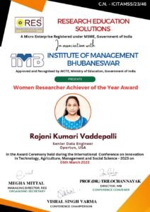 On 5th March 2023, during the International Conference on Innovation in Technology, Agriculture, Management and Social Science (ICITAMSS-2023), Rajani Kumari Vaddepalli, Senior Data Engineer at Oportun, USA, was honored with the prestigious Women Researcher Achiever of the Year Award. The event was organized by Research Education Solutions (RES) in association with the Institute of Management, Bhubaneswar, approved by the AICTE, Ministry of Education, Government of India.